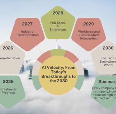 Explores the accelerating velocity of AI transformation from 2025 to 2030, charting how businesses and society will evolve as artificial intelligence becomes central to every industry. It examines the current breakthroughs, predicts future trends, and highlights the growing divide between AI adoption and risk awareness. The article offers actionable guidance for professionals, emphasizing lifelong learning, ethical responsibility, and adaptability to prepare for the tech-driven world of 2030.